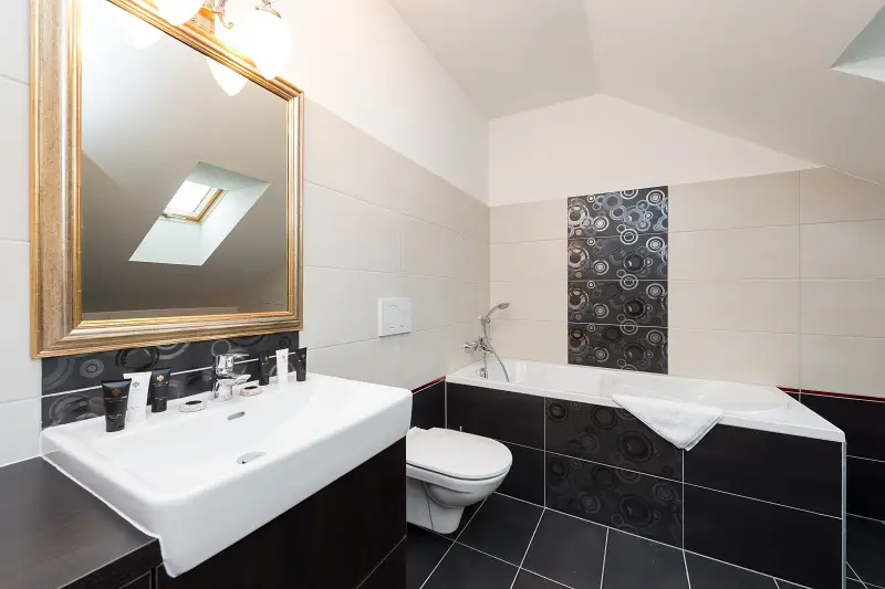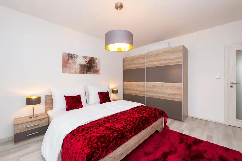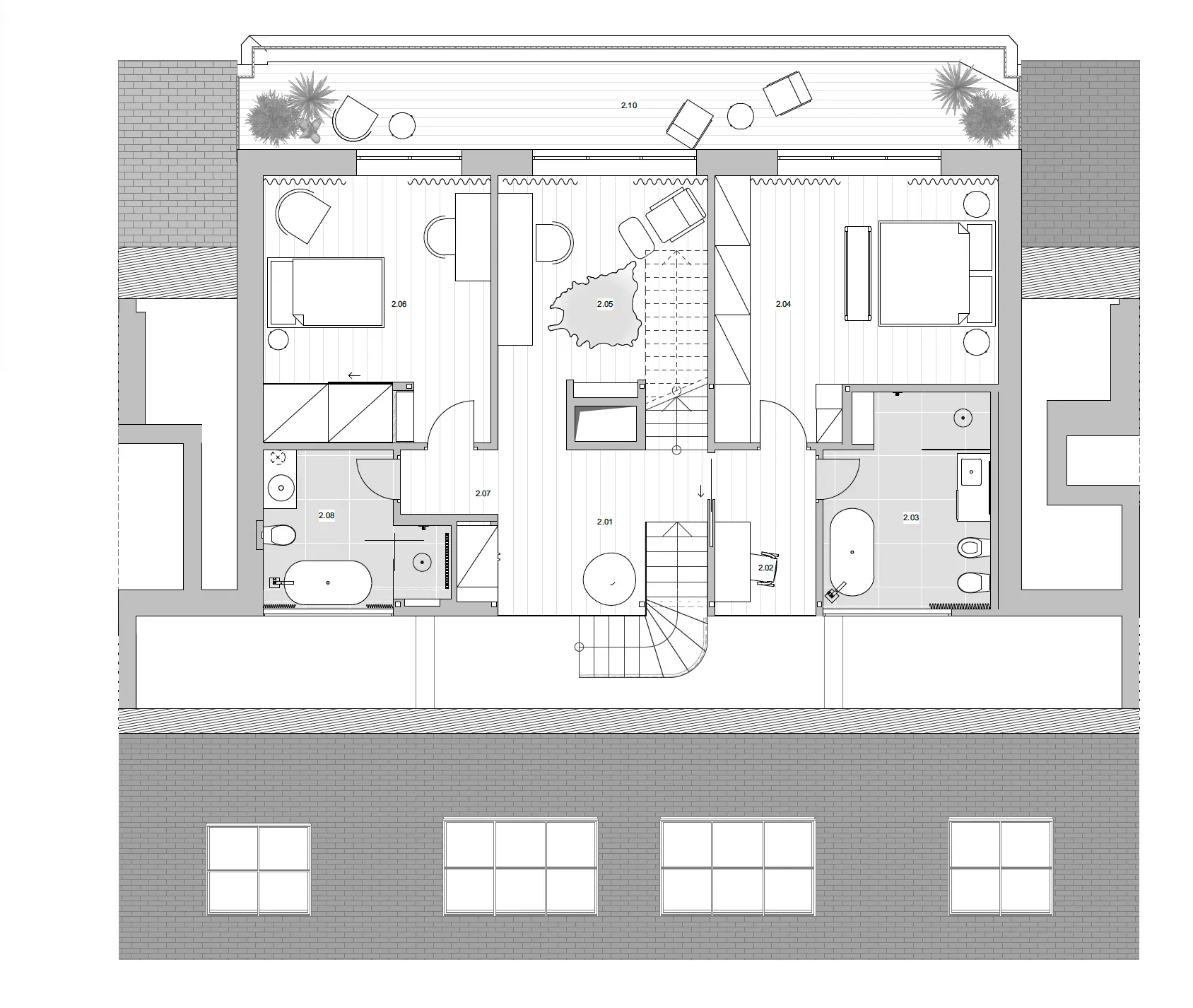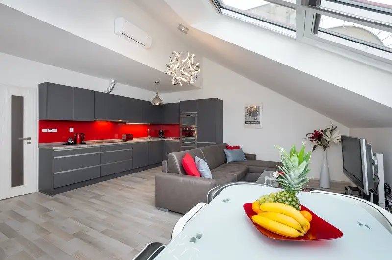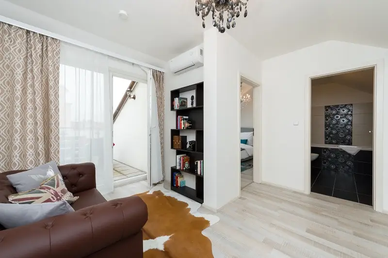 The main floor of the apartment consists of an open, fully equipped custom kitchen by KIKA with Whirlpool appliances, with plenty of natural light from it’s south facing windows. The main floor also consists of a bedroom with an en-suite bathroom and toilet, hallway, and a laundry / utility room. Upstairs you will find a 2nd bedrooms with high ceilings and exposed roof beams a second bathroom with bathtub and toilet. There is custom built-in cabinetry throughout the apartment as well as parquet floors and air-conditioning; heating is provided by its own Junkers gas boiler.